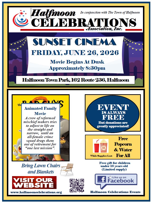 Sunset Cinema All Movies will be shown at the Halfmoon Town Park Friday, June 26, 2026 – at dusk (around 8:30 p.m.) Friday, July 24, 2026 – at dusk (around 8:15 p.m.) Friday, August 21, 2026 – at dusk (around 8:00 p.m.)