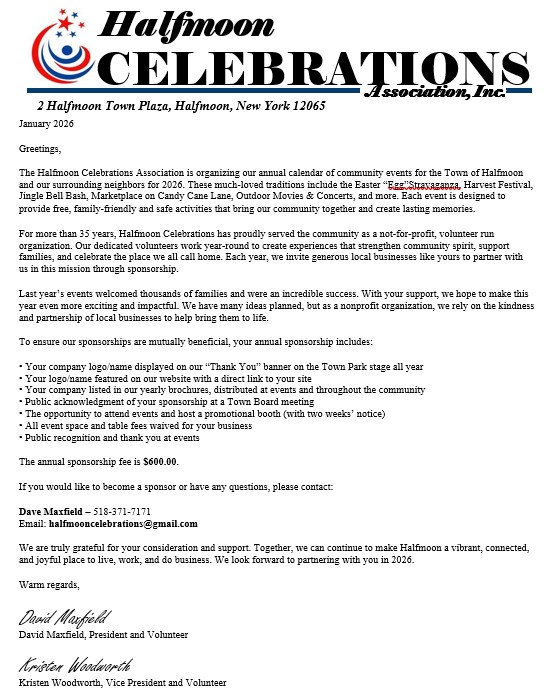 Sponsorship provided by local businesses and individuals allows Halfmoon Celebrations Association, Inc. to deliver free family-fun events in a secure, safe and friendly environment that builds on the foundation of a strong, neighborly community. The Association takes pride in providing these events for over 35 years and each year our local businesses and individuals support our mission by sponsoring these amazing events. Please consider supporting our sponsors.