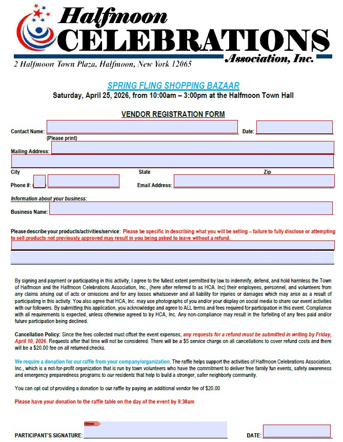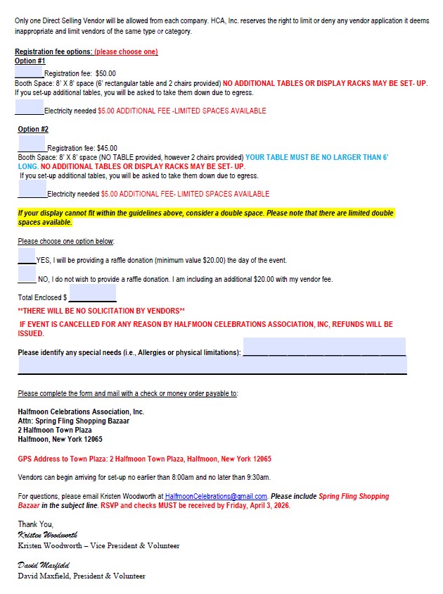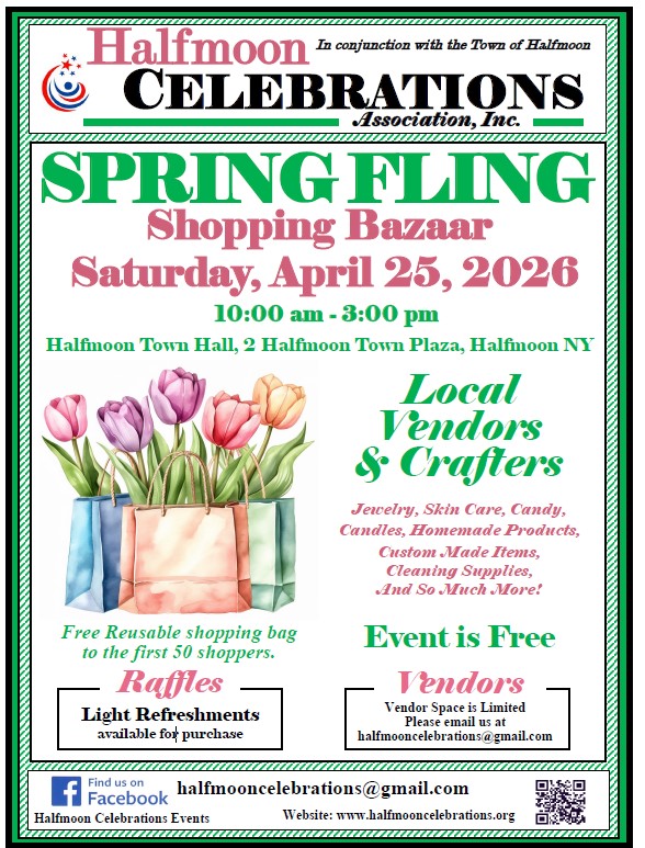 Spring Fling Shopping Bazaar Saturday, April 25, 2026 10:00 a.m. – 3:00 p.m. at the Halfmoon Town Hall Spring Fling 2026 Vendor Application